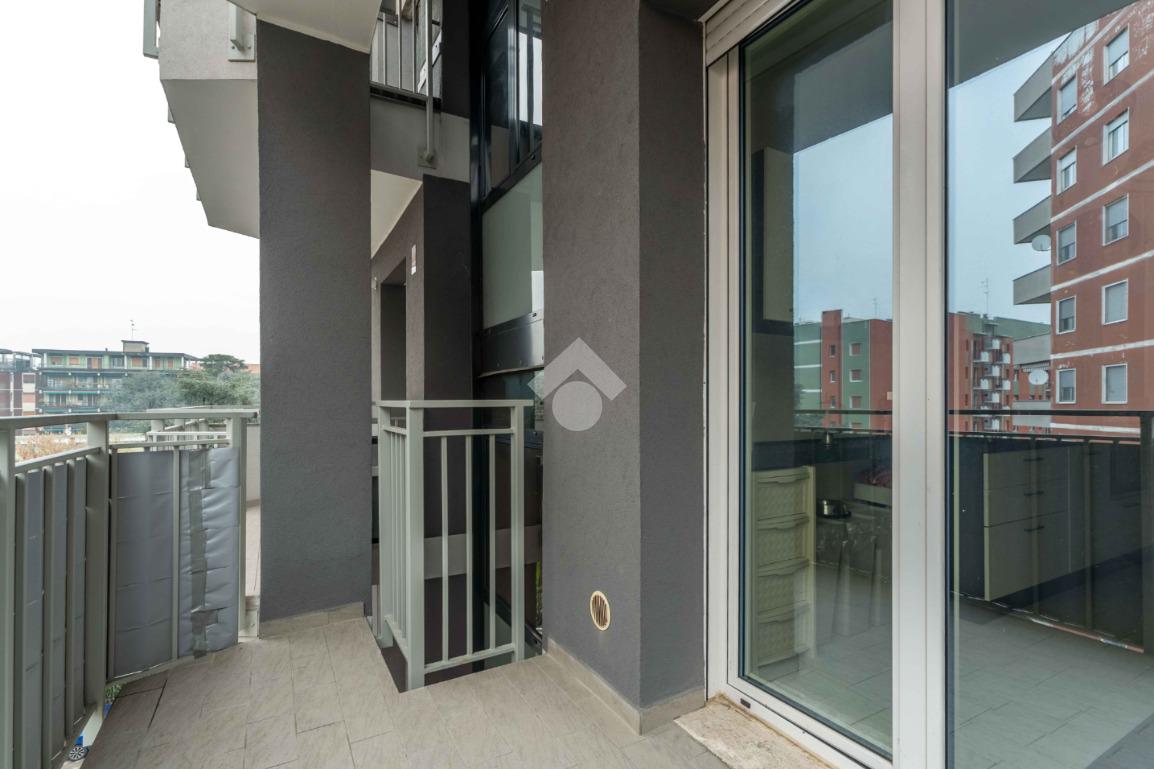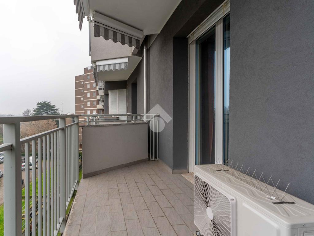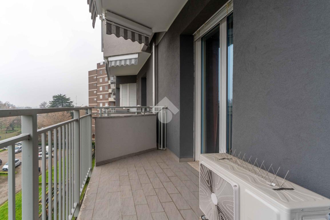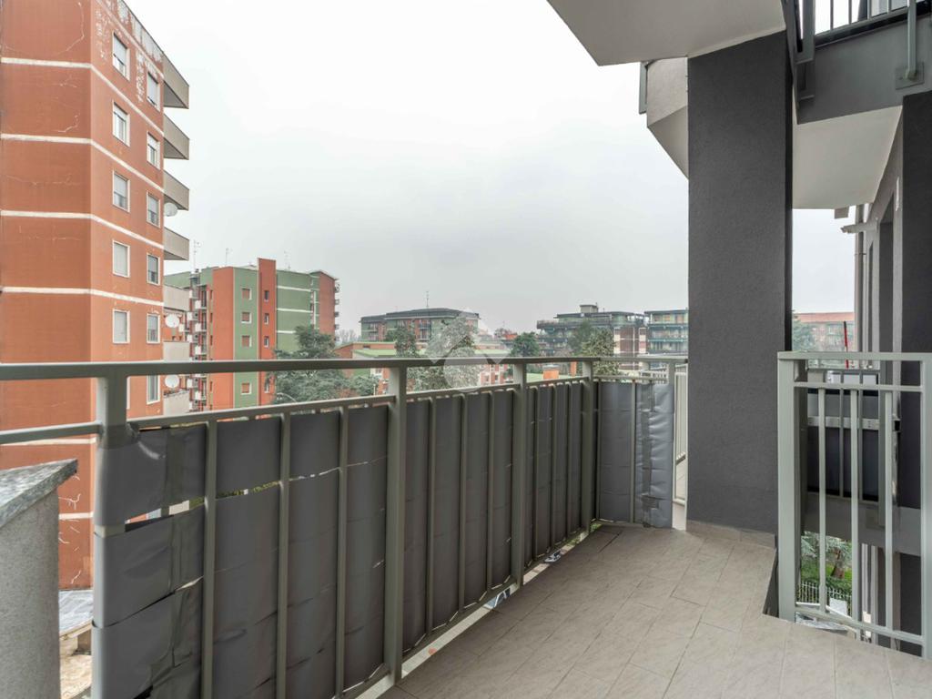 La soluzione è composta da grande soggiorno con terrazzino, cucina abitabile con balcone, due camere di generose dimensioni, bagno finestrato con doccia e pratico ripostiglio.