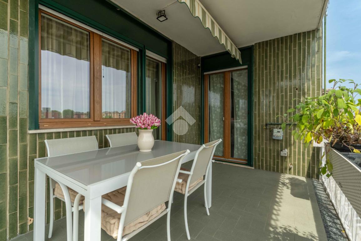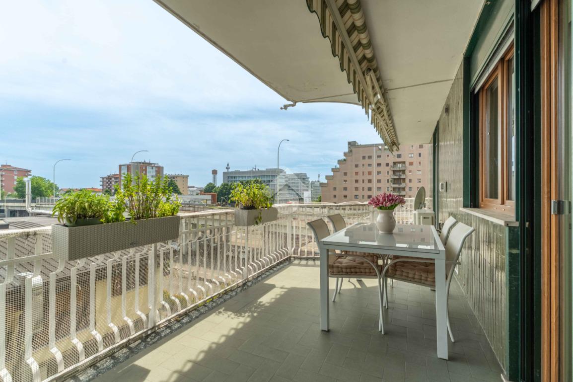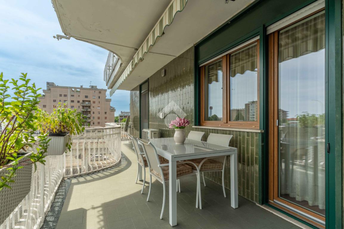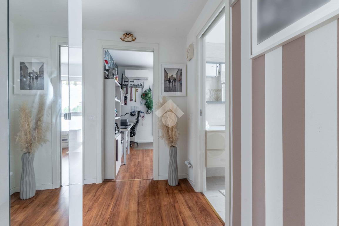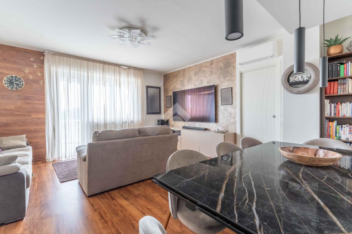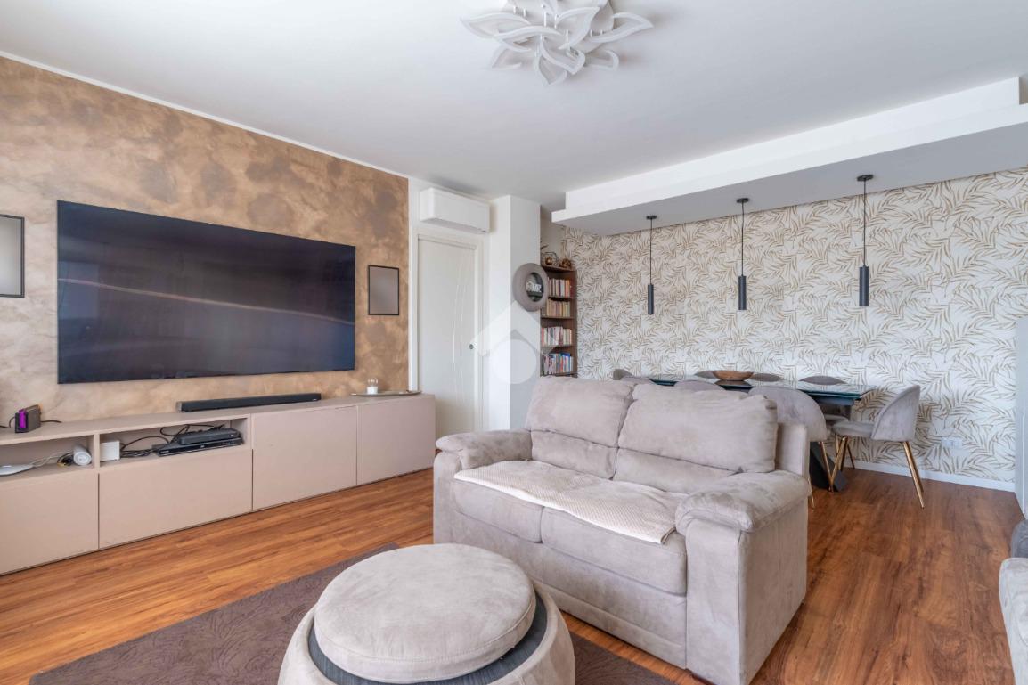 L'ingresso si apre su un luminoso soggiorno con cucina all'americana, caratterizzato da grandi finestre che conducono a un terrazzo vivibile, perfetto per godere di momenti di relax all'aria aperta. L'esposizione a sud garantisce luce naturale durante tutto il giorno, mentre le tende da sole motorizzate e le zanzariere offrono privacy e comfort.