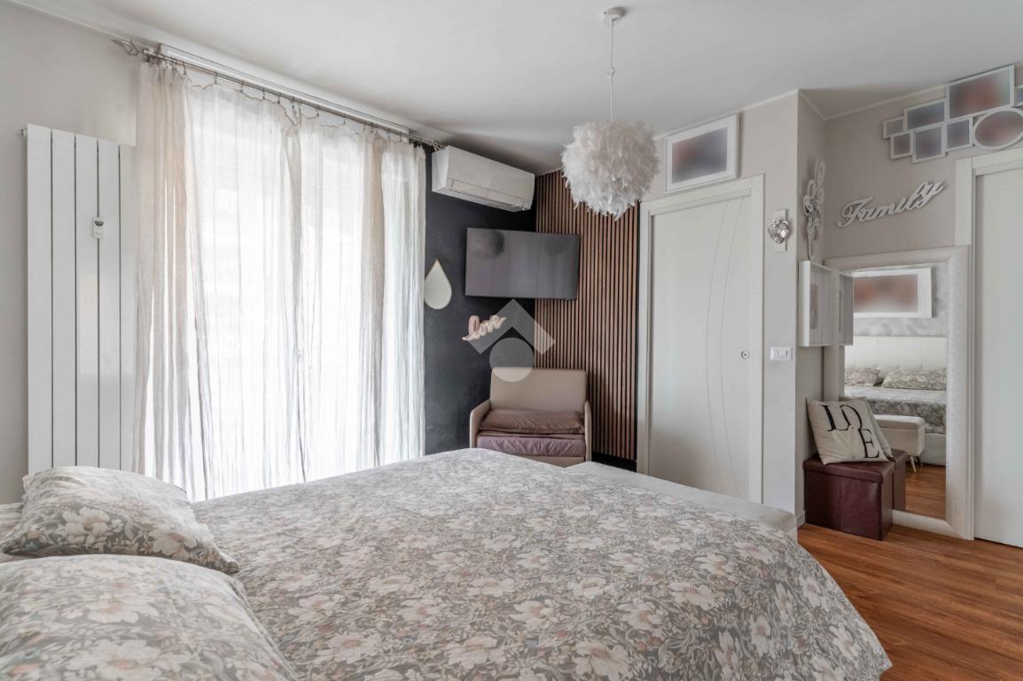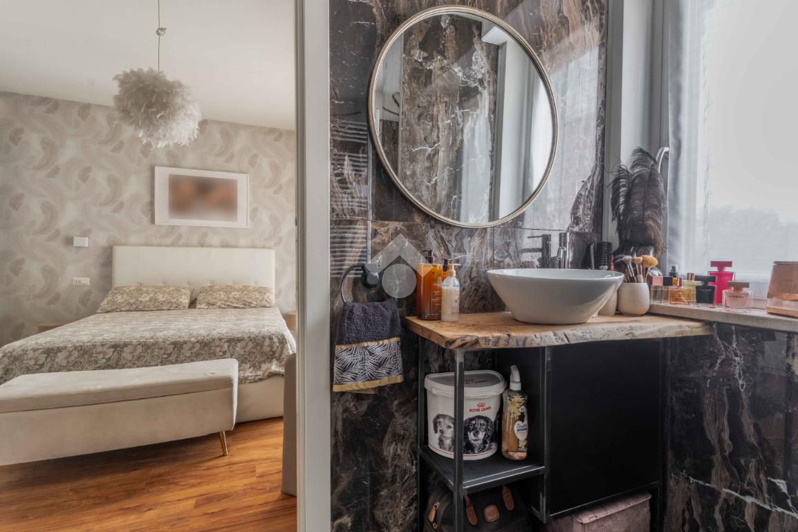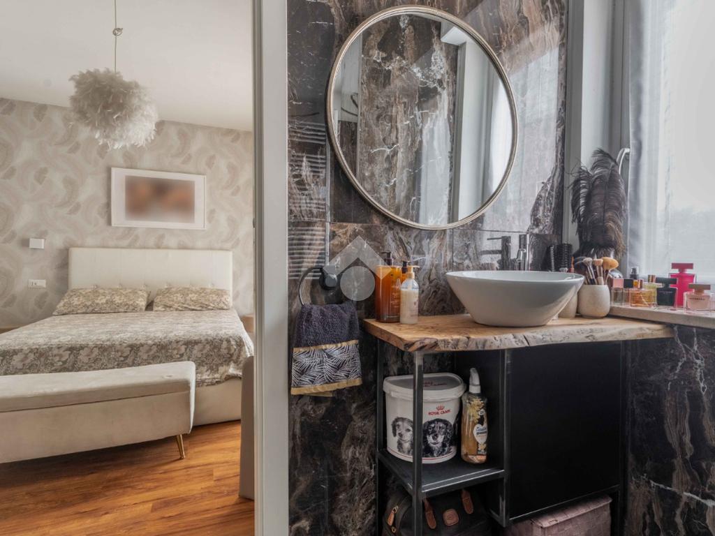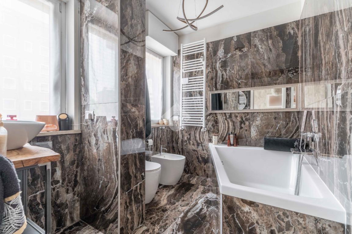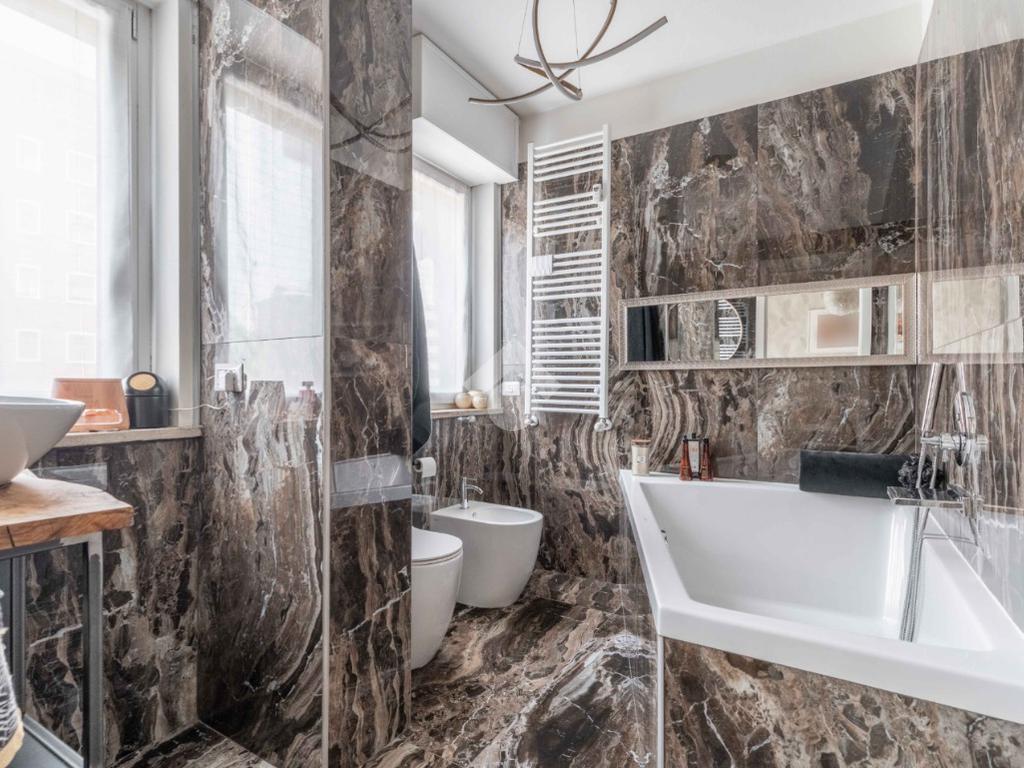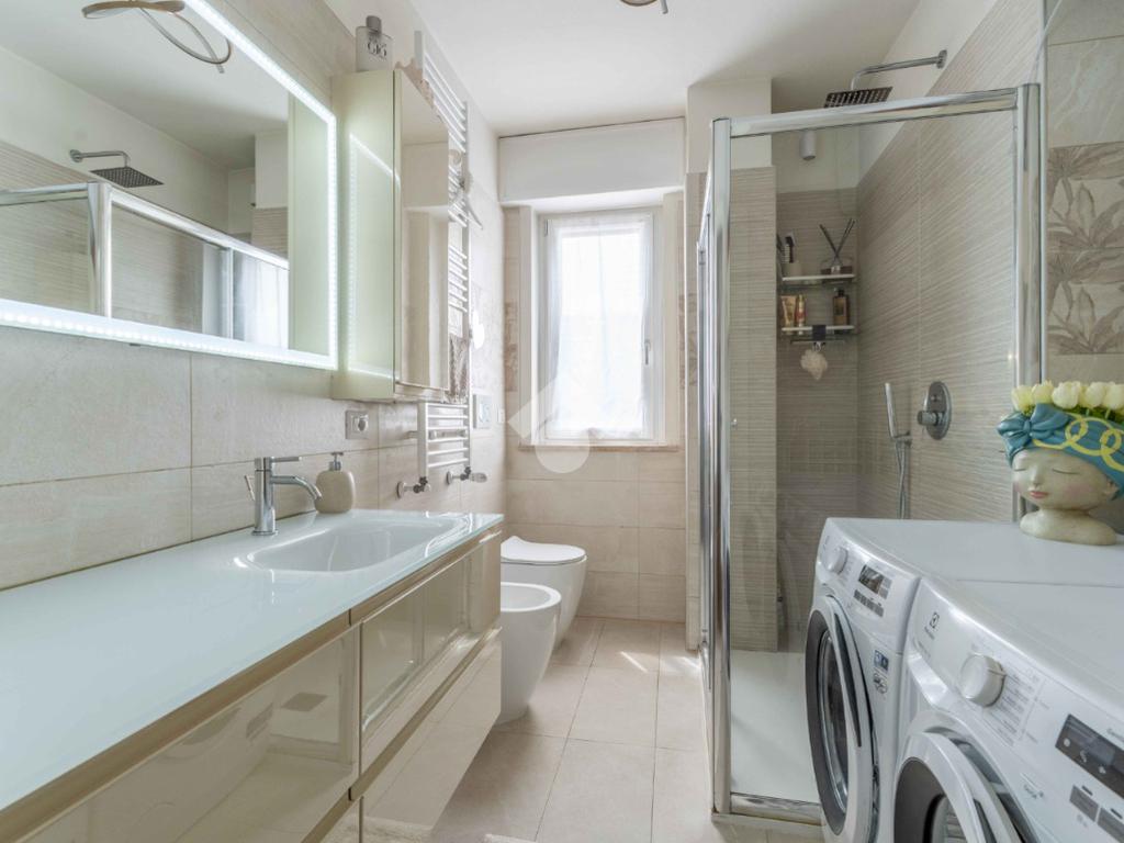 L'appartamento è composto da due ampie camere da letto, di cui una suite padronale con bagno in camera e cabina armadio. Il secondo bagno, finestrato e dotato di doccia, è elegante e funzionale.